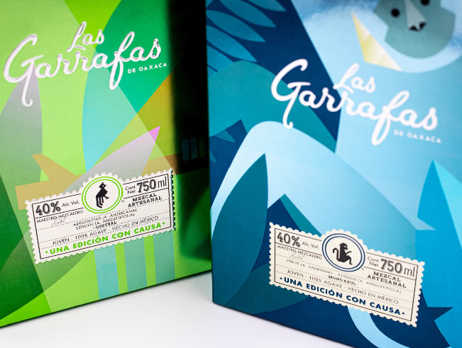 El talento joven de la diseñadora le dio un aliento diferente al mezcal Mono azul, custodio de la alegría. Con un toque fresco y vanguardista, sus ilustraciones nos permiten imaginarnos el mundo dentro del cual habitan los personajes de Las Garrafas.